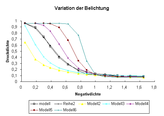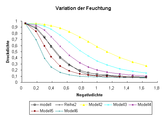 Die beiden folgenden Diagramme zeigen die Möglichkeit der Modellierung bei Variation der Variablen "Belichtungszeit" und "Feuchtung" in Bezug auf die gemessene Lichtdruck- Kennlinie.