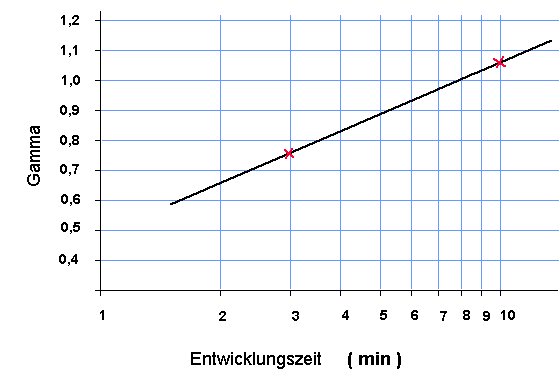 | * Ermittlung der Entwicklungszeit für ein bestimmtes Gamma: - Den Gradiationsbereich des Films entnimmt man dem Datenblatt des Herstellers. - der dort genannte Entwicklertyp kann durch das eigene Produkt ersetzt werden - Die Entwicklungszeit und das Gamma haben einen logarithmischen Zusammenhang. - Erstellt man ein Gamma/Zeit-Diagramm mit einer logarithmischen Zeitachse wird aus dieser Funktion eine Gerade. |